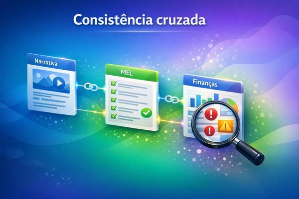 4) Consistência cruzada (narrativa ↔ MEL ↔ finanças)